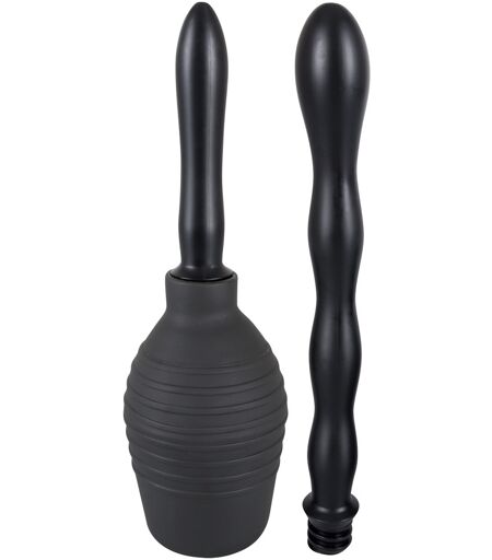 Schwarze Intimdusche (13 cm hoch, Fassungsvermögen 300 ml) mit zwei austauschbaren Schraub-Aufsätzen mit Spritzdüsen. Einfach zu reinigen. Langer, gewellter Aufsatz: Gesamtlänge ca. 23 cm, Ø 1,7-3 cm. Kurzer, glatter Aufsatz: ca. 11,5 cm lang Ø 1,9-2,3 cm). Material: PVC. ...