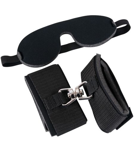 Gepolsterte Handfesseln mit metallenem Drehring in der Mitte und Klettverschluss. 1 gepolsterte Augenbinde mit dehnbarem Band ist ebenfalls im Set dabei. Perfekt für Einsteiger geeignet! Fesseln geöffnet 34 cm lang, 6 cm breit. 60% PP, 33% PE, 5% PU, 2% Metall. Alle Metallteile sind verchromt. ...
