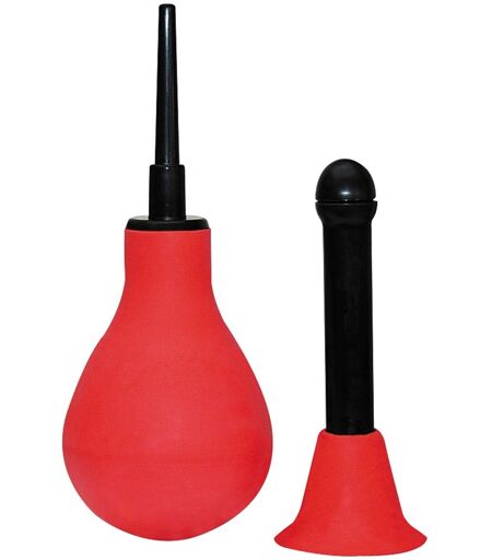 Knallroter Pumpball (10 cm hoch, Füllmenge 220 ml) mit Klistierkanüle (8 cm lang, Ø 0,5 cm-1 cm) und Vagina-Duschaufsatz (14 cm lang, Ø 1,5 cm-2 cm) mit Stopper. Einfach den Pumpball befüllen und je nach Sex-Laune entweder mit der Klistierkanüle darmputzende Lust oder mit dem Vagina-Duschaufsatz prickelnde Spritz-Feelings genießen! Material: PP (Aufsätze), PVC. ...