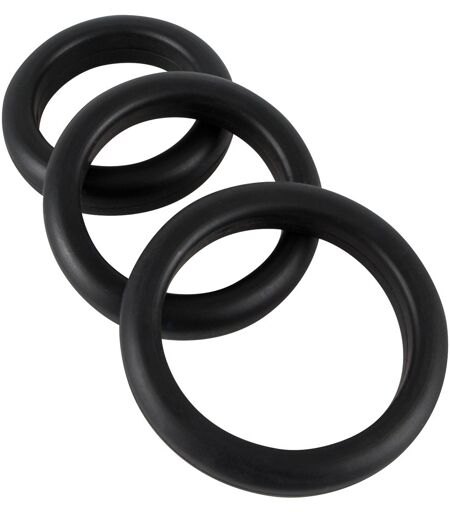 Drei schwarze, unterschiedlich große Penis-/Hodenringe im Set. Verschiedene, dehnbare Ø: 3,5 cm, 4 cm und 4,5 cm. Jeweils 0,7 cm stark. Silikon. ...