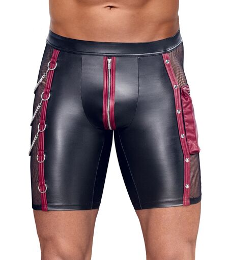 Enge betonende Pants von NEK mit unterlegtem Reißverschluss im Beutel. Im coolen schwarzen Mattlook mit roten Kontraststreifen und silberfarbenen Details. Weich, elastisch und mit bezogenem Bundgummi für maximalen Tragekomfort. Jeweils seitlich Netz-Einsatz. Auf der einen Seite zusätzlich mit Ringen und 3 abnehmbaren Karabiner-Ketten, auf der anderen Seite Nieten und eine aufgesetzte Cargotasche mit Reißverschluss. 90% Polyester, 10% Elasthan Netz 90% Polyamid, 10% Elasthan. ...