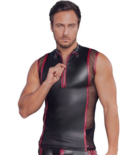 Ärmelloses Shirt von NEK in körpernaher Schnittführung. Cooler schwarzer Mattlook mit roten Kontraststreifen und silberfarbenen Details. Mit seitlichen Netz-Einsätzen und kurzem Front-Reißverschluss. Kleiner Stehkragen mit dekorativen Ringen vorne. Rundum weich und elastisch für besten Tragekomfort. 90% Polyester, 10% Elasthan Netz 90% Polyamid, 10% Elasthan. ...