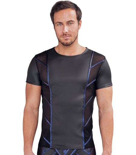 Betonendes Kurzarm-Shirt von NEK im coolen schwarzen Mattlook. Jeweils seitlich schwarz-transparente Netz-Einsätze mit aufgesetzten, rasanten Diagonalstreifen im blauen Metallic-Mattlook. Rundum weich und elastisch für besten Tragekomfort. 90% Polyester, 10% Elasthan, Polyurethan-Beschichtung Netz 90% Polyamid, 10% Elasthan. ...