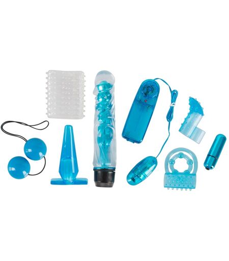 Inhalt: 1. Multispeed-Vibrator mit angedeuteter Eichel und reizstrukturiertem Schaft. 17,4 cm lang, Ø 2,8-3,4 cm. 2. Penismanschette mit Reiznoppen und Wellen. 7 cm lang, Innen-Ø 3,3 cm (sehr dehnbar). 3. Vibro-Ei mit kabelgebundenem Bedienelement. 5,5 cm lang, Ø max. 2,5 cm Kabel 66 cm lang. 4. Vibro-Bullet - einsetzbar in 5.-7. 6 cm lang, Ø 1,7 cm. 5. Penis-/Hodenring mit Noppen für zusätzliche Klitorisstimulation. Penisring mit 5 Kugeln, Hodenring glatt. Penisring Innen-Ø 2,4 cm, Hodenring Innen-Ø 4 cm beide sehr dehnbar. 6. Fingerhülle mit G-Punkt-Spitze und genoppter Oberfläche. 5,5 cm lang. 7. Analplug, spitz zulaufend. 9,2 cm lang, Ø max. 2,9 cm. 8. Liebeskugeln mit Rückholband (Polyamid). 26 cm lang, Ø 3,4 cm. ABS, TPE. Batterien bitte extra bestellen: 2 x AAA und 2 x AA. ...