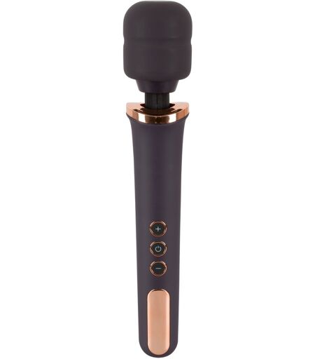 Wiederaufladbarer Massagestab mit glänzenden Kupfer-Applikationen. Mit 10 Vibrationsmodi in jeweils 5 Geschwindigkeitsstufen. Massagekopf mit beweglichem Hals. Inklusive USB-Kabel. Einfach und intuitiv bedienbar: Zum Einschalten den Power Button in der Mitte so lange gedrückt halten, bis sich der Massagestab einschaltet. Durch wiederholtes Drücken auf diesen Knopf, wird der Vibrationsmodus gewechselt. Über die Buttons Plus (+) und Minus (-) wird dann die Geschwindigkeit reguliert. Durch erneutes längeres Drücken des Power Buttons schaltet sich der Massagestab dann wieder aus. Gesamtlänge 33 cm, Länge Kopf 6,3 cm, Ø 5,7 cm. Silikon mit PU, ABS. ...