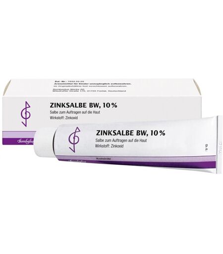 Anwendungsgebiet von Zinksalbe BwDas Arzneimittel ist ein Hautprotektivum.Zinkoxid wirkt abdeckend-protektiv und sekretbindend bei akuten und subakuten Dermatosen.Wirkstoffe / Inhaltsstoffe / Zutaten100 mg Zink oxidWollwachsalkoholsalbe Hilfstoff (+)GegenanzeigenDas Arzneimittel darf nicht angewendet werden, wenn Sieüberempfindlich (allergisch) gegen Zink oder einen der sonstigen Bestandteile von dem Arzneimittel sind.Bei der Anwendung auf großen Hautarealen sollen nicht mehr als 20 % der Körperoberfläche behandelt werden.DosierungWenden Sie das Arzneimittelimmer genau nach Anweisung hier an. Bitte fragen Sie bei Ihrem Arzt oder Apotheker nach, wenn Sie sich nicht ganz sicher sind.Das Arzneimittel wird einmal bis mehrmals täglich auf die betroffenen Hautstellen aufgetragen und gegebenenfalls mit Mull abgedeckt. Dauer der AnwendungDie Dauer der Behandlung ist uneingeschränkt und vom Heilungsverlauf abhängig.EinnahmeDas Arzneimittel wird einmal bis mehrmals täglich auf die betroffenen Hautstellen aufgetragen und gegebenenfalls mit Mull abgedeckt.PatientenhinweiseBesondere Vorsicht bei der Anwendung von dem ArzneimittelBenutzung von KondomenBei der Anwendung von dem Arzneimittel im Genital- und Analbereich kann es wegen der Hilfsstoffe Vaselin und Paraffin bei gleichzeitiger Anwendung von Kondomen aus Latex zu einer Verminderung der Reißfestigkeit und damit zu einer Beeinträchtigung der Sicherheit von Kondomen kommen. Verkehrstüchtigkeit und das Bedienen von MaschinenEs sind keine besonderen Vorsichtsmaßnahmen erforderlich.SchwangerschaftSchwangerschaft und StillzeitSchwangerschaftZinkoxid kann bei bestimmungsgemäßem Gebrauch und Einhaltung der Dosierungsanleitung in der Schwangerschaft angewendet werden. Doch sollte eine großflächige Anwendung vermieden werden.StillzeitZinkoxid kann bei bestimmungsgemäßem Gebrauch und Einhaltung der Dosierungsanleitung in der Stillzeit angewendet werden. Doch sollte eine großflächige Anwendung an der Brust bei st ...