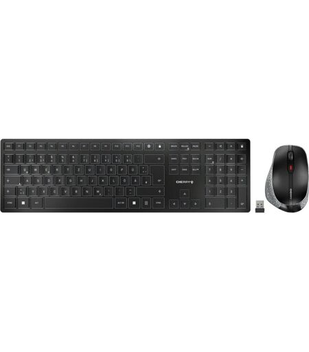 Beim CHERRY DW 9500 SLIM finden zwei Topseller zueinander. Die silber-schwarze Wireless-Tastatur CHERRY KW 9100 SLIM und die ergonomisch geformte Rechtshandmaus CHERRY MW 8C ERGO sind ein wahres Dreamteam. Modernste Technik und beste Verarbeitungsqualität vereinen sich mit edlem Design zu einem wahren Blickfang am Schreibtisch. Die Maus ist mit ihrer ergonomischen Form ausgelegt zur Bedienung mit der rechten Hand und ideal für große Hände geeignet. Maustasten aus eloxiertem Aluminium und gummierte Seitenteile mit Daumenauflage ermöglichen stundenlanges komfortables Arbeiten. Durch ihren hochpräzisen Sensor mit Laser-LED, funktioniert die MW 8C Ergo auf nahezu allen Oberflächen - sogar auf Glastischen - und per Knopfdruck lässt sich die Auflösung 4-stufig auf bis zu 3.200 dpi einstellen. Die flache Funktastatur wurde mit höchster Sorgfalt entwickelt und punktet mit der CHERRY SX-Scherentechnologie. Sie verspricht ein präzises und angenehmes Tippgefühl und sorgt dafür, dass man mühelos und produktiv durch den Arbeitstag kommt. Einen Beitrag dazu leistet die stabile Verarbeitung mit einer integrierten Metallplatte, mit der die Tastatur sicher auf dem Schreibtisch liegt und dabei schlank und anmutig bleibt. Für die Verbindung des DW 9500 SLIM stehen zwei Wege zur Verfügung: Bluetooth 4.0 oder über 2,4 GHz mit Hilfe des USB-Empfängers. Der Wechsel zwischen beiden Verbindungsarten gelingt ganz einfach mit Hilfe eines Schiebe-Schalters an Maus und Tastatur. So lässt sich z. B. ein Notebook per Bluetooth und zusätzlich ein PC über Funk mit dem gleichen Desktop bedienen. Die Übertragung hat in beiden Fällen eine Reichweite von bis zu 10 m und ist nach AES-128 verschlüsselt. ...