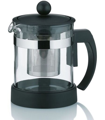 Formschöne Teekanne Auron aus hitzebeständigem Glas mit Siebeinsatz aus Edelstahl und Kunststoff-Elementen. Höhe 15,5 cm, Fassungsvermögen 0,7 Liter. ...
