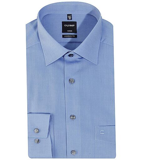 Chambraygewebe - Verstärkter Kentkragen Langarm Ärmelmanschette mit zwei Knöpfen Brusttasche links mit kleiner Logostickerei Glänzendes Gewebe Farbe: Mittelblau Abgerundeter Saum Bügel- und Knitterfrei Material: 100% Baumwolle Die Marke OLYMP ist Mitglied der Fair Wear Foundation. ...