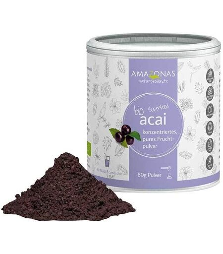 Nahrungsergänzungsmittel sind kein Ersatz für eine ausgewogene, abwechslungsreiche Ernährung und eine gesunde Lebensweise.BIO Açai PulverUnser Lieferant verwendet nur handverlesene Beeren, die schonend ohne synthetische Zusätze zu einem wertvollen natürlichen Fruchtpulver verarbeitet werden, mit einem hohen Gehalt an Antioxidantien, vor allem Polyphenolen und der typischen dunkellila Farbe.Zutaten: BIO Acai Fruchtpulverextrakt (ohne Zusatzstoffe, Rohkostqualität ).Nährwerte: Durchschnittliche Nährwerte pro 100 g pro 5 g Energie 2271 kJ / 549 kcal 114 kJ / 27 kcal Fett 42 g 2,1 g -davon gesättigte Fettsäuren 11 g 0,6 g Kohlenhydrate 22 g 1,1 g -davon Zucker 13 g 0,7 g Ballaststoffe 23 g 1,2 g Eiweiß 9,6 g < 0,5 g Salz 0,09 g < 0,01 g Verzehrempfehlung:Täglich 5 g Pulver (ca. 1 gehäufter Teelöffel) in ein beliebiges Getränk, Müsli oder Joghurt einrühren oder direkt auf der Zunge zergehen lassen.Hinweis:Die angegebene empfohlene tägliche Verzehrmenge darf nicht überschritten werden.Aufbewahrung: Kühl (6-25 °C) und lichtgeschützt lagern. Außerhalb der Reichweite von Kindern aufbewahren.Nettofüllmenge: 80 g PulverHerstellerdaten: AMAZONAS Naturprodukte Handels GmbH Helmholtzstr. 8268723 Schwetzingen ...
