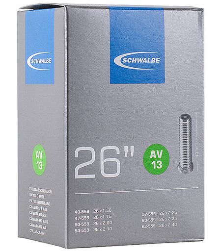 Schwalbe Standard Fahrradschlauch Nr. 13 Für Fahrradreifen in der Größe 26" Zoll (ETRTO 40/62-559) Besonders geeignet für MTB Hält die Luft überdurchschnittlich lang dank bester Materialgüte und gleichmäßiger Wandstärke Höchste Zuverlässigkeit, die sich millionenfach bewährt hat Ventil: AV Ventillänge: 40 mm Ausführung: Standard Größe: ETRTO 40/62-559 Typ: Butyl Gewicht: 190 g Symbolbild: Abbildung kann abweichen. ...