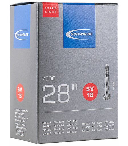 Schwalbe EXTRA LIGHT Fahrradschlauch Nr. 18 Für Fahrradreifen in der Größe 28" Zoll/700C (ETRTO 28/44-622) Geringeres Gewicht, bei gleicher Zuverlässigkeit wie ein Schwalbe Standard Schlauch Ventil: SV Ventillänge: 40 mm Ausführung: Extralight Größe: ETRTO 28/44-622 Typ: Butyl Gewicht: 105 g Symbolbild: Abbildung kann abweichen. ...