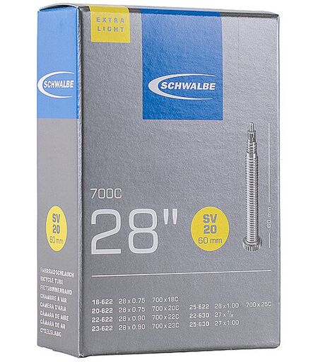 Schwalbe EXTRA LIGHT Fahrradschlauch Nr. 20 Für Fahrradreifen in der Größe 28" Zoll/700C (ETRTO 18/25-622/630) Besonders geeignet für Rennrad Geringeres Gewicht, bei gleicher Zuverlässigkeit wie ein Schwalbe Standard Schlauch Ventil: SV Ventillänge: 60 mm Ausführung: Extralight Größe: ETRTO 18/25-622/630 Typ: Butyl Gewicht: 70 g Symbolbild: Abbildung kann abweichen. ...