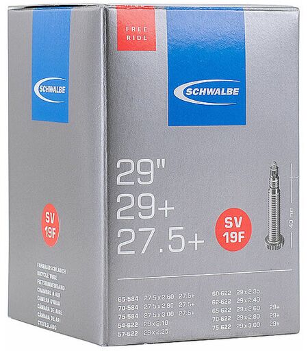 Schwalbe FREERIDE Fahrradschlauch Nr. 19F Für Fahrradreifen in den Größen 27.5" und 29" Zoll (ETRTO 54/75-584/622) Ideal für Fahrer, die Wert auf großes Volumen bei geringem Gewicht legen Besonders gut geeignet für viele E-Bikes und E-MTBs Ventil: SV Ventillänge: 40 mm Ausführung: Freeride Größe: ETRTO 54/75-584/622 Typ: Butyl Gewicht: 215 g Symbolbild: Abbildung kann abweichen. ...