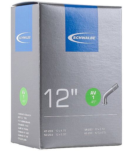 Schwalbe Schlauch 12 Zoll mit 45° Schrader-/Auto-Ventil. Extrem luftdruckstabil! Die Gummimischung macht es möglich: Weniger Luftverlust und seltener pumpen. Extrem zuverlässig! Qualitätskontrolle für sicheren Fahrspaß: jeder Schwalbe Schlauch wird im Werk zweifach auf Lufthaltigkeit überprüft. Details: Passende für folgende Reifendimensionen: 47-203 (12" x 1,75") 50-203 (12" x 2") 54-203 (12" x 2,10") 62-203 (12" x 2,4") ...