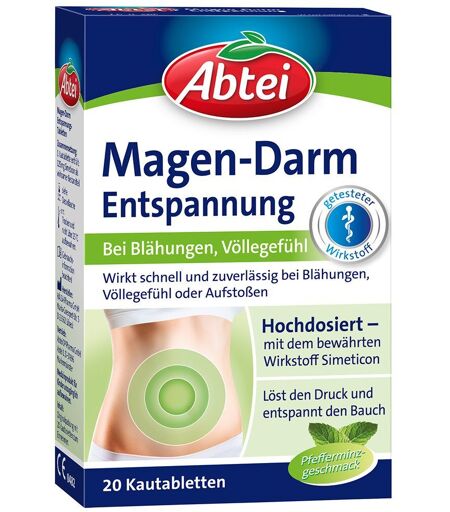 Abtei Magen-Darm Entspannung Abtei Magen-Darm Entspannung löst mit dem gut verträglichen Wirkstoff Simeticon die erhöhten Gasansammlungen auf. Durch das Kauen der Kautablette wird der Wirkstoff bereits im Mund freigesetzt und kann seine Wirkung im Magen sofort entfalten. Magen-Darm Entspannung – Bei Blähungen, Völlegefühl und Aufstoßen: Löst den Druck – entspannt den Bauch Mit dem bewährten Wirkstoff Simeticon Wirkt schnell und zuverlässig Wirkstoff klinisch getestet Frischer Pfefferminzgeschmack Leicht einzunehmende Kautabletten Ungewohnte Speisen, schwer verdauliche und gärende Lebensmittel, wie Hülsenfrüchte und Kohl, aber auch eine eingeschränkte Magen-Darmtätigkeit können zu Verdauungsbeschwerden mit Spannungen und Druckgefühlen im Bauchraum führen. Die Folge sind Blähungen, Völlegefühl oder Aufstoßen. Diese Beschwerden werden durch Gasansammlungen im Bauchraum verursacht. Die Siliziumverbindung Simeticon löst diese Gasansammlungen auf und führt so zu einer Linderung der Beschwerden. Simeticon ist dabei gut verträglich und wird vom Körper wieder ausgeschieden. Abtei Magen-Darm Entspannungs-Tabletten sind leicht einzunehmende Kautabletten mit einem angenehmen Pfefferminzgeschmack. Mit 125 mg Simeticon sind sie hochdosiert und schnell wirksam bei Spannungen und Druckgefühlen im Bauchraum. Abtei Magen-Darm Entspannungs-Tabletten ¿ schnell und sanft wirksam bei Blähungen, Völlegefühl oder Aufstoßen. Zusammensetzung 1 Kautablette enthält Arzneilich wirksame Bestandteile 125 mg Simeticon Sonstige Bestandteile: Dextrates, Sorbitol, Tricalciumphosphat, Sacchrarose, Maisstärke, Talkum, Citronensäure, wasserfrei; Pfefferminzaroma anwenden. Dosierungsanleitung Sofern vom Arzt nicht anders verordnet, nehmen Erwachsene und Kinder über 12 Jahre eine Magen-Darm-Entspannungstablette (entsprechend 125 mg Simeticon) 3 mal täglich oder bei Bedarf ein. Abtei Magen-Darm Entspannungs-Tabletten. Anwendungsgebiete: Zur symptomatischen Behandlung gasbedingter Magen-Darm-Beschwerden, z. B. Völlegefühl, Aufstoßen, Blähungen. Zu Risiken und Nebenwirkungen lesen Sie die Packungsbeilage und fragen Sie Ihren Arzt oder Apotheker. Lactosefrei ...