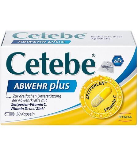 Das Besondere an Cetebe ABWEHR plus ist, dass es 300 mg ZEITPERLEN®-Vitamin C, 10 μg Vitamin D und 10 mg Zink enthält. Dabei setzen die ZEITPERLEN® das Vitamin C über viele Stunden frei. Das Vitamin D ist in Form von Vitamin D3 enthalten, welches gut vom Körper aufgenommen werden kann. Das Zink liegt als Zinkgluconat mit ebenfalls guter Verwertbarkeit im Körper vor.