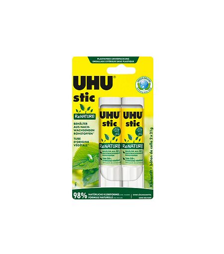 Mit gutem Gewissen kleben - mit den UHU stic ReNATURE KlebestiftenDie UHU stic ReNATURE Klebestifte sind optimal geeignet zum Kleben von Papier, Pappe, Fotos, Textilien, Holz, Styropor. Sie sind lösungsmittelfrei, auswaschbar, geruchsarm, schnell trocknend. UHU stic ReNATURE - das bewährte Klebemittel für Büro, Schule oder zuhause!Denken Sie an die UmweltDie Klebestifte befinden sich in einem Behälter aus 58% nachwachsenden Rohstoffen. Dieser ist zu 100% recycelbar und die Klebemasse ist zu 98% naturbasiert. Auch in wenig belüfteten Räumen können Sie die UHU stic ReNATURE Klebestifte mit gutem Gewissen verwenden. Sie sind geruchsarm und lösungsmittelfrei.Einfaches ArbeitenDer transparente Klebstoff hat eine optimale Härte für ein leichtes Verstreichen. Er ist schnell trocknend und damit auch bei kurzfristigen Klebeaktionen ein perfekter Helfer. Die Schraubkappe verhindert das Austrocknen.Bestellen Sie gleich 2 UHU stic ReNATURE Klebestifte 2x 21,0 g - jetzt preisgünstig im Pack hier in unserem Online-Shop. ...