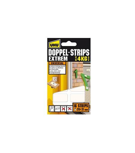 Extrem stark: die Doppelstrips EXTREM von UHUDie UHU Doppelstrips EXTREM sind extrem belastbare, doppelseitige Klebestrips und eignen sich für die Montage von Schildern, Hausnummern, Halterungen, Haken, Ablageelementen, Dekorationsobjekten, Zierleisten u.v.m, finden Sie äußerst vielseitig Verwendung.Wenn Sie beispielsweise Garderobenhaken an der Wand befestigen möchten, ohne zu bohren, dann greifen Sie zu den UHU Doppelstrips EXTREM. Sie sind bis 4,0 kg belastbar und lassen sich schnell, sauber und einfach verarbeiten.Sie erhalten 16 UHU Doppelstrips mit den Maßen 26,0 x 31,0 mm (BxL).Wenn Sie also lieber kleben statt bohren, dann greifen Sie zu den UHU Doppelstrips EXTREM aus unserem Online-Shop. Wir beliefern Sie super schnell und günstig. ...