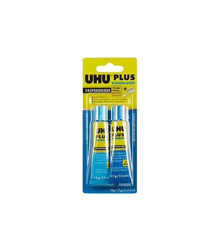 Der hält schon nach 20 Minuten bombenfest!Der lösungsmittelfreie 2-Komponenten-Epoxidharzkleber UHU plus schnellfest ist perfekt für hohe Belastungen auf kleinen Flächen geeignet. Der Verarbeitungszeitraum liegt bei bis zu 5 Minuten und ist somit ideal, wenn Sie ein schnelles Klebe-Ergebnis brauchen. Der UHU 2 Komponenten-Kleber plus schnellfest ist nach nur 20 Minuten handfest. Die entstandene transparente Klebung ist schlagfest und beständig gegen Alterung und Feuchtigkeitseinwirkung.Der wasserfeste UHU 2 Komponenten-Kleber plus schnellfest ist geeignet für folgende Materialien: Metalle, Glas, Porzellan, Keramik, Holz, Marmor, Stein, Beton, Duroplast, glasfaserverstärkte Kunststoffe, Hart-PVC, Gummi und Hartschaum-Kunststoffe wie z.B. Styropor. Nicht geeignet ist er dagegen für Klebungen auf großen Glasflächen, PE und PP.Verfügen auch Sie zusammen, was zusammengehört, und bestellen Sie das UHU-Set bestehend aus Binder und Härter jetzt in unserem Online Shop.Gefahrenhinweise:- Verursacht Hautreizungen.- Verursacht schwere Augenreizung.- Kann allergische Hautreaktionen verursachen.- Giftig für Wasserorganismen, mit langfristiger Wirkung.Sichervheitshinweise:- Ist ärztlicher Rat erforderlich, Verpackung oder Kennzeichnungsetikett bereithalten.- Darf nicht in die Hände von Kindern gelangen.- Vor Gebrauch Kennzeichnungsetikett lesen.- Einatmen von Staub/Rauch/Gas/Nebel/Dampf/Aerosol vermeiden.- Schutzhandschuhe/Schutzkleidung/Augenschutz/Gesichtsschutz tragen.- Freisetzung in die Umwelt vermeiden.- BEI BERÜHRUNG MIT DER HAUT: Mit viel Wasser waschen.- BEI KONTAKT MIT DEN AUGEN: Einige Minuten lang behutsam mit Wasser spülen. Eventuell vorhandene Kontaktlinsen nach Möglichkeit entfernen. Weiter spülen.- Entsorgung des Inhalts / des Behälters gemäß den örtlichen / regionalen / nationalen/ internationalen Vorschriften.Signalwort: AchtungGefahrenklasse/-kategorie:- Giftig für Wasserorganismen, mit langfristiger Wirkung. Kat 2- Verursacht Hautreizungen. Kat 2- Verursacht schwere Augenreizung. Kat 2- Kann allergische Hautreaktionen verursachen. Kat 1 ...