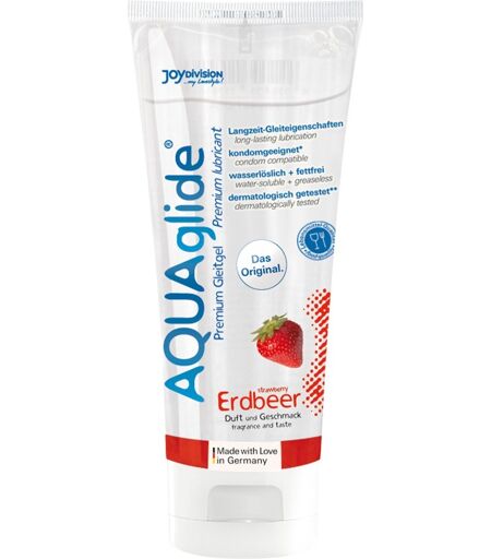 Veganes Gleitgel AQUAglide Erdbeer von Joydivision auf Wasserbasis mit naturidentischem Erdbeer-Duft und -Geschmack sowie optimalen Langzeit-Gleiteigenschaften. In zuckerfreier Lebensmittelqualität - auch zur oralen Verwöhnung geeignet. Hochwirksam und ergiebig. Öl- und fettfrei. Dermatologisch getestet und pH-optimiert für Intim-Balance. Latexkondomsicher. Qualität made in Germany. 100 ml. ...