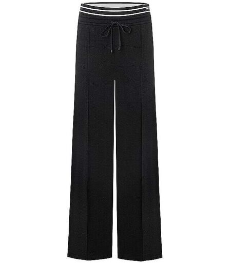 Damen Marlenehose aus angenehmem Baumwoll-Viskose-Stretch Hohe Taille Elastischer Bund mit Tunnelzug Streifenmuster Seitliche Eingrifftaschen Unifarben Weiter Beinverlauf Farbbezeichnung: Black Material: 40% Baumwolle, 35% Viskose, 23% Polyester, 2% Elasthan ...
