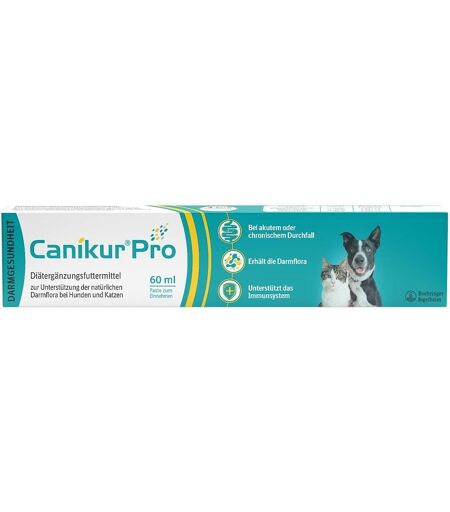 Diätfuttermittel für HundeCanikur® Pro Paste Canikur® Pro ist ein pro- und präbiotisches Diätergänzungsfuttermittel für Hunde und Katzen zur Regulation der physiologischen Darmfunktion bei unkomplizierten Durchfallerkrankungen. Canikur® Pro ist eine Paste, die über das Futter oder direkt in das Maul des Hundes oder der Katze gegeben wird.Canikur® Pro enthält Probiotische Milchsäurebakterien Präbiotischen Hefeextrakt Bio-Mos™- C als Nährboden für Probiotika Giftbindendes Mineral (Montmorillonit) Das clever kombinierte ErgänzungsfuttermittelZur Unterstützung der natürlichen Darmflora in Stressphasen, bei akutem Durchfall und während der Regeneration ist eine Paste und leicht zu füttern schmeckt gut passt in die Reiseapotheke Dosierung Gewicht Dosis in ml Häufigkeit < 10 kg 2 2 x täglich 11 - 25 kg 4 2 x täglich 26 - 40 kg 6 2 x täglich 41 - 60 kg 8 2 x täglich > 60 kg 10 2 x täglich Katze 1 - 2 2 x täglich So unterstützt Canikur® Pro die Darmflora gleich mehrfach: Probiotische Milchsäurebakterien sind im Verdauungstrakt lebensfähige Mikroorganismen, deren positiver Einfluss auf die Darmflora in vielen Studien belegt wurde. Sie bilden ein Schutzschild für die Darmwand und stimulieren das Immunsystem. Canikur® Pro enthält Enterococcus faecium, ein probiotisches Milchsäurebakterium. Präbiotika regen als Substrat gezielt das Wachstum und die Aktivität bestimmter, für die Darmflora günstiger Bakterienarten an. Der speziell für Kleintiere entwickelte Hefeextrakt Bio-Mos®-C ist ein Präbiotikum, welches das Gleichgewicht der Darmflora zugunsten günstiger Bakterienarten wie Lacto-und Bifidobakterien beeinflusst. Bio-Mos®-C verringert die Anzahl von Salmonella und E. coli im Darm, indem es deren Rezeptoren blockiert. Montmorillonit ist ein Mineral (Schichtsilikat), das Toxine und Viren bindet und aus dem Organismus entfernt. Montmorillonit hilft dabei, Durchfall und Erbrechen zu bekämpfen, virale Infekte schneller zu überstehen und Vergiftungen vorzubeugen.Zusammensetzung: Sojaöl, inaktivierte Hefe, Lupinproteinmehl, Glukose, Natriumchlorid, Disodiumphosphat, SonnenblumenölAnalytische Bestandteile: Enerococcus faecium (DSM 10663/NCIMB 10415) (Darmflora-Stabilisator): 2 x 1012 CFU / kg Bentonit 1m5581 (Montmorillonit, Adsorptionsmittel): 17 % ...