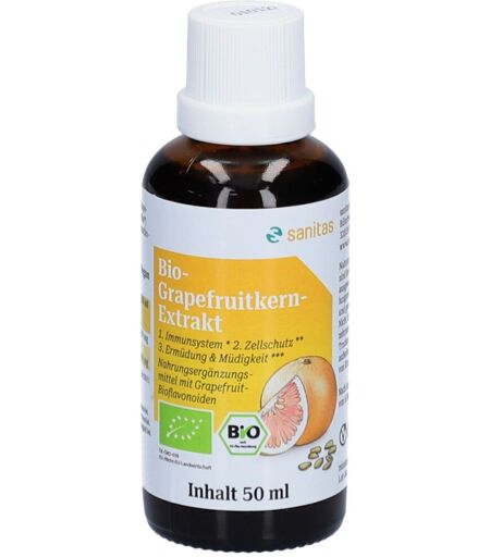 Nahrungsergänzungsmittel sind kein Ersatz für eine ausgewogene und abwechslungsreiche Ernährung und eine gesunde Lebensweise. Grapefruitkernextrakt - Powerfrucht GrapefruitEine der bemerkenswertesten Verwendungsmöglichkeiten der Grapefruit hat sich 1980 durch die Entwicklung des Grapefruitkernextraktes (kurz auch GKE) in den USA ergeben. Dieser wird mittlerweile von der sanitas unter pharmazeutischen Reinraumbedingungen und unter Einhaltung strengster hygienischer Anforderungen und ständigen Qualitätskontrollen in Deutschland selber hergestellt – völlig rückstandsfrei und selbstverständlich ohne Alkohol.Die Produktvorteile:Zertifizierte Bioqualität.Jahrelang traditionell bewährte Formulierung.Zur Extraktion verwenden wir pflanzliches, palmölfreies Bioglycerin.Natürlich ohne Alkohol.Frei von Benzethoniumchlorid, Benzalkoniumchlorid, Triclosan und Pestizidrückständen.Sicherheit & Qualität „Made in Germany“.Unterliegt einer ständigen Qualitätskontrolle.Zutaten:glycerinhaltiger Extrakt aus Bio-Grapefruitschalen* und -kernen* (83 %), Wasser, Antioxidationsmittel: Ascorbinsäure*Zur Herstellung werden ausschließlich Grapefruits aus kontrolliert biologischem Anbau verwendet (DE-Öko-039)Nährwerte:DurchschnittlicheNährwertangabenTagesverzehrempfehlung(45 Tropfen)100 mlVitamin C67,5 mg*3000 mgGrapefruit - Bioflavonoide9 mg400 mg* 84,4 % der Referenzmengefür die tägliche Zufuhr nach LMIV Verzehrempfehlung:3 x 15 Tropfen (15 Tropfen = 0,75 ml) täglich in Wasser oder Saft geben und trinken.Hinweise: Bitte überschreiten Sie nicht die empfohlene tägliche Verzehrmenge. Bitte trocken, nicht über 25°C und außerhalb der Reichweite von kleinen Kindern lagern.Nettofüllmenge:50 mlHersteller:sanitas - biologische Nahrungsergänzungs- und Heilmittel GmbH & Co. KGBillerbecker Str. 6732839 Steinheim ...