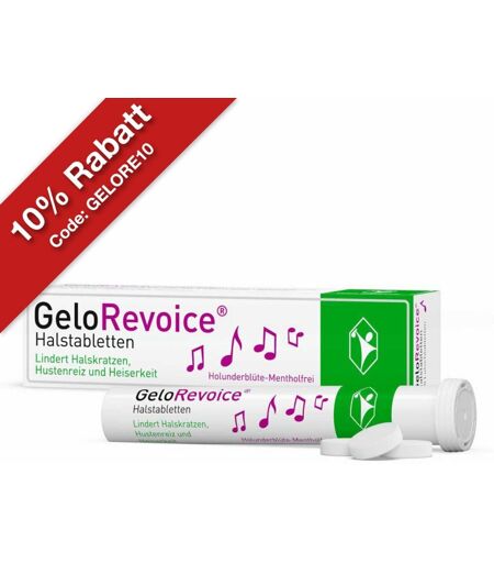 In zahlreichen Berufen ist die Stimme das wichtigste Arbeitsinstrument. Sänger und Vielsprecher wie Lehrer, Verkäufer oder Erzieher bleiben im Akutfall mit GeloRevoice Halstabletten Holunderblüte-Mentholfrei Lutschtabletten besser gut bei Stimme. Die Lutschtabletten sind auch vorbeugend und im Rahmen einer Langzeittherapie geeignet.