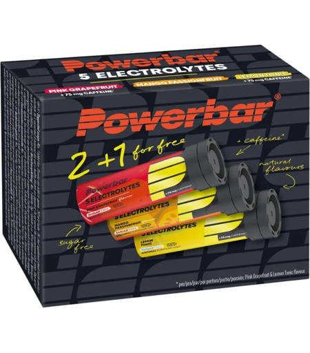 PowerBar 5 Electrolytes 2+1 gratis - Multiflavour Vorteilspack. 5 Elektrolyte. 0 Zucker. 0 Kalorien. 100% Erfrischung. Bei ausgewählten Trainings möchtest du nur Wasser trinken, um so keine Kalorien oder Kohlenhydrate zu dir zu nehmen oder auch den Fettstoffwechsel zu optimieren. Während des Sports verlierst du jedoch über den Schweiß auch Elektrolyte, die zahlreiche, wichtige Funktionen im Körper erfüllen. Genau hier setzen die PowerBar 5Electrolytes Brausetabletten an. Sie ergeben ein hochwertiges, kalorienfreies Sportgetränk mit den 5 Elektrolyten, die du mengenmäßig am meisten über den Schweiß verlierst - ideal für Grundlagenausdauertraining und wann immer du Sport treibst, aber keine Kalorien oder Zucker zu dir nehmen willst. Nahrungsergänzungsmittel Brausetablette zur Herstellung eines kalorienfreien Erfrischungsgetränkes mit 5 Mineralstoffen und Süßungsmittel. 3 Geschmacksrichtungen. 3 Röhrchen mit je 10 Tabletten 5 Electrolytes liefert dem Körper die 5 Hauptelektrolyte (Natrium, Chlorid, Kalium, Magnesium und Calcium) im Verhältnis wie man sie durch Schweiß verliert Null Zucker - Null Kalorien Erfrischend, fruchtiger Geschmack durch natürliche Aromen Frei von Aspartam und Konservierungsstoffen 10 Tabletten ergeben je nach gewünschter Geschmackintensität bis zu 7,5 Liter Fertiggetränk Geschmacksrichtungen: Mango, Grapefruit, Lemon So verwendest du das Produkt: Allgemeine Flüssigkeitszufuhrempfehlung für Aktivitäten >60 Minuten: Zubereitung: 1 Tablette je nach Geschmackspräferenz in 500 bis 750 ml Wasser auflösen Ca. 200 – 300ml in der Stunde vor dem Sport trinken Während des Sports alle 15 Minuten ca. 150 – 200ml trinken 1-4 Tabletten (für koffeinfreie Geschmacksrichtungen) bzw. 1-2 Tabletten (für Geschmacksrichtungen mit Koffein) pro Tag Dieses Nahrungsergänzungsmittel sollte nicht als Ersatz für eine abwechslungsreiche Ernährung verwendet werden. Die empfohlene Verzehrmenge darf nicht überschritten werden. Außerhalb der Reichweite von kleinen Kindern lagern. Für koffeinhaltige Geschmacksrichtungen: Enthält Koffein. Für Kinder und schwangere Frauen nicht empfohlen. Inhalt: 3 x 42g á 10 Tabs Zutaten: Säuerungsmittel (Citronensäure), Säureregulator (Natriumcarbonate), Mineralstoffe (14,7%) (Kaliumchlorid, Calciumcarbonat, Natriumchlorid, Magnesiumhydroxid, Calciumphosphate), Feuchthaltemittel (Sorbit), Inulin, natürliche Aromen, Stärke, Maltodextrin, Süßungsmittel (Sucralose), Rote-Bete-Saftpulver, Farbstoff (Lutein). Nährwertkennzeichnung: pro 100 g pro Tablette (4,2 g) pro 4 Tabletten (4 x 4,2 g) Energie kJ (kcal) 810 (194) 34 (8) 137 (33) Fett 0 g 0 g 0 g davon gesättigte Fettsäuren 0 g 0 g 0 g Kohlenhydrate 13,8 g 0,6 g 2,4 g davon Zucker 1,1 g 0 g 0,2 g Eiweiß 0,1 g 0 g 0 g Salz 15,0 g 0,63 g 2,52 g Mineralstoffe: pro 100 g pro Tablette (4,2 g) pro 4 Tabletten (4 x 4,2 g) Natrium 5952 mg 250 mg 1000 mg Kalium 3571 mg 150 mg (7,5%*) 600 mg (30%*) Chlorid 4762 mg 200 mg (25%*) 800 mg (100%*) Calcium 1429 mg 60 mg (7,5%*) 240 mg... ...
