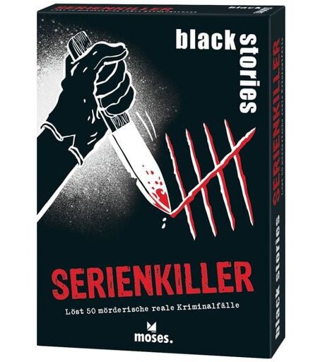 Sie sind schwarz, rätselhaft und durch und durch böse: black stories – Das ist DIE Kultreihe bei moses. In den morbiden, gruseligen, erschreckenden und zum Teil unterhaltsamen Rätseln geht es um den Tod und Unfälle, die nicht grauenhafter sein können. Durch Raten sollen die Geschichten hinter rätselhaften Fällen herausgefunden werden. Nicht immer ganz so einfach… Seid ihr bereit für diese ultimative True-Crime-Rätselsammlung des Grauens? Angsteinflößend, unfassbar grausam und hart am Limit: In den black stories Serienkiller findet ihr 50 mörderische reale Kriminalfälle, die euch das Blut in den Adern gefrieren lassen. Und das Haarsträubendste daran: Alles ist genauso passiert, bis aufs letzte Gliedmaß... nichts für schwache Nerven also! Schafft ihr es, die rabenschwarzen Fälle zu lösen? So wird’s gespielt: Die Rateteam-Variante: Das Kartenset enthält 50 knifflige, rabenschwarze Rätselkarten für Teenager und Erwachsene, die es durch geschicktes Fragen zu lösen gilt. Am meisten Spaß macht es, black stories zusammen mit Freund*innen zu knacken. Eine*r, der*die Gebieter*in, nimmt eine Karte aus dem Stapel, liest die kurze Geschichte vor, die auf der Vorderseite der Karte steht. Auf der Rückseite der Karte findet sich die Antwort, die der*die Gebieter*in natürlich für sich behält. Nun muss das Ratevolk sich an die Auflösung der Geschichte „heranfragen“. Dabei sollten die Fragen so formuliert sein, dass man sie mit „ja“ oder „nein“ beantworten kann. Ein gruselig-lustiger Ratespaß für kleine und große Gruppen – auch digital spielbar. Rätselprofi-Spielvariante: Pro Spiel werden drei Rätselkarten gelöst. Nur die Spielleitung kennt die Lösung und das Rateteam nähert sich dieser Schritt für Schritt durch Fragen, Raten und Tüfteln ... wie gewoht! Aber aufgepasst: Besonders clevere Fragen, die auf eine heiße Fährte führen, werden mit Punktechips belohnt. Wer am Ende des Spiels die meisten Punktechips gesammelt hat, gewinnt! ...