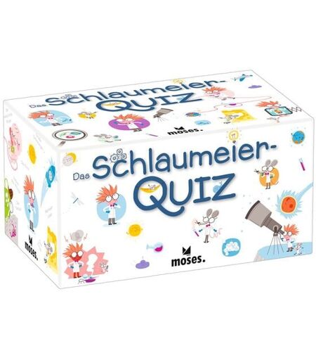 "Gibt es auf allen Planeten Tag und Nacht? Warum sind die Mammuts ausgestorben? Und was ist ein Kumulonimbus? Ein Quiz-Spiel für schlaue Füchse und neugierige Forscher! Mit 100 Schlaumeier-Fragen zu den Themen: Das Weltall, Die Erde, Das Klima, Abenteuer Leben, Der menschliche Körper, Große Erfindungen, Rätsel des Alltags.So wird's gespielt: Jeder Spieler zieht eine Karte aus jeder der verschiedenen Kategorien. Der jüngste Spieler beginnt. Er deckt eine seiner Karten auf. Handelt es sich um eine Solo-Karte, darf nur er die Frage beantworten. Ist die Antwort richtig, darf er die Karte behalten und bei sich ablegen. Handelt es sich um eine Chance-Karte, dürfen alle Spieler mitraten. Der Spieler, der am schnellsten die richtige Antwort parat hat, bekommt die Karte. Ziel des Spiels ist es, seine Karten als erstes komplett abzulegen und die höchste Menge an abgelegten Karten auf dem eigenen Stapel zu haben. 1991 startet der moses. Verlag GmbH als kleiner Kinderbuchverlag. Im Laufe der Jahre entwickelte moses. Ihre Klassiker: Die Becherlupe, die rabenschwarzen ""black stories"" sowie ihren umfangreichen Produktkatalog " ...
