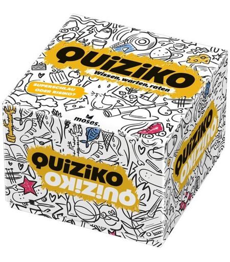 "Wissen, Warten, Raten: Völlig ahnungslos? Gefährliches Halbwissen? Oder ein*e Besserwisser*in? Bei diesem Spiel können alle mitmachen. Denn wer sich bei Quiziko, dem Quiz mit dem gewissen Risiko, traut, die Antwort früh abzugeben, sahnt ordentlich Punkte ab oder riskiert leer auszugehen, während die anderen vorbeiziehen. Denn nach und nach fallen falsche Antworten der insgesamt 300 Quizfragen weg und damit steigt die Chance, richtigzuliegen und Punkte zu kassieren. Das Quizspiel überzeugt mit einem innovativen Spielprinzip und sorgt dank des Risikofaktors für besonders spannenden Spielspaß. Ein Muss für Quizfans und ein tolles Spiel für den nächsten Spieleabend! Inhalt: 150 Quizkarten mit 300 Fragen, 1 Spiegel, 1 Antworttafel, 30 Antwortmarker, 5 Punktemarker, 4 Abdeckungen, 1 Spielanleitung 1991 startet der moses. Verlag GmbH als kleiner Kinderbuchverlag. Im Laufe der Jahre entwickelte moses. Ihre Klassiker: Die Becherlupe, die rabenschwarzen ""black stories"" sowie ihren umfangreichen Produktkatalog " ...