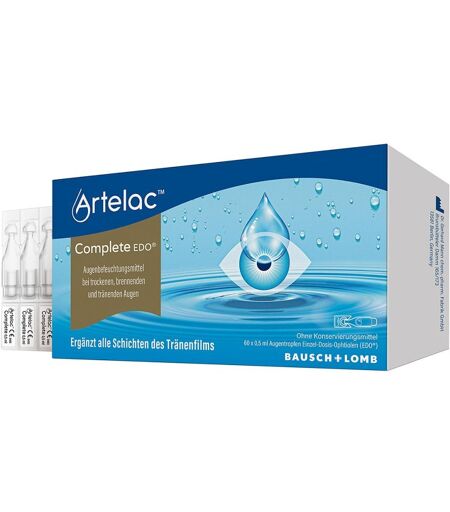 Anwendungsgebiet von Artelac Complete EDO Augentropfen bei trockenen AugenArtelac Complete EDO Augentropfen bei trockenen Augen bieten eine umfassende Lösung zur gezielten Linderung der Symptome bei den häufigsten Formen des trockenen Auges. Artelac Complete EDO Augentropfen bei trockenen Augen basieren auf der Zusammensetzung der natürlichen Tränenflüssigkeit: Ein einziger Tropfen versorgt alle drei Schichten des Tränenfilms. Die Augentropfen stabilisieren mit Lipiden die äußere Schicht, wodurch die Verdunstung der Tränenflüssigkeit reduziert wird. Der natürliche Feuchtigkeitsspender Hyaluronsäure sowie Glycerin binden Feuchtigkeit, während das Carbomer zusätzlich befeuchtet und Wasser im Tränenfilm bindet.