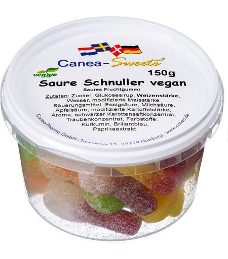 Anwendungsgebiet von Saure Schnuller vegan Canea-sweetsSaure Schnuller vegan Canea-sweets sind saures Fruchtgummi.Wirkstoffe / Inhaltsstoffe / ZutatenZutaten von Saure Schnuller vegan Canea-sweets: