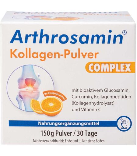 Anwendungsgebiet von Arthrosamin Kollagen Complex PulverArthrosamin Kollagen Complex Pulver ist ein Nahrungsergänzungsmittel mit bioaktivem Glucosamin, Curcumin, Vitamin C und Kollagenpeptiden (Protein).
