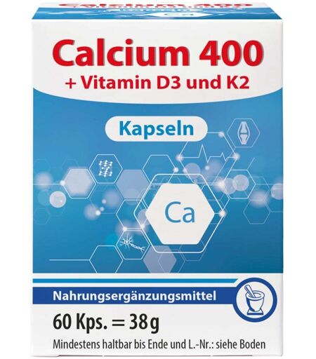 Wirkungsweise von Calcium 400 KapselnVitamin D3 und Calcium tragen zur Erhaltung normaler Knochen, Zähne und einer gesunden Muskelfunktion bei. Vitamin K trägt zur Erhaltung normaler Knochen bei. Zusätzlich trägt Calcium zu einer normalen Signalübertragung zwischen den Nervenzellen bei.Wirkstoffe / Inhaltsstoffe / ZutatenCalcium 400 Kapseln enthalten:Calciumcarbonat, Gelatine (Rind), Vitamin K2 (Menaquinon), Vitamin D3 (Cholecalciferol), Trennmittel Magnesiumsalze der Speisefettsäuren, Farbstoff Calciumcarbonat.