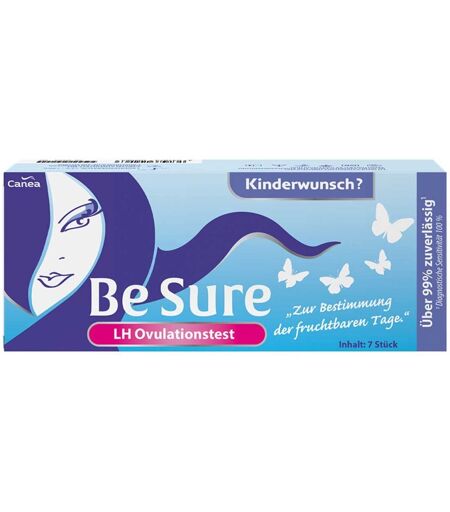 Anwendungsgebiet von Be Sure Ovulationstest bei KinderwunschBe Sure Ovulationstest bei Kinderwunsch bestimmen Sie Ihre fruchtbaren Tage mit einer erwiesenen Zuverlässigkeit von 99%. Im Zyklus einer Frau gibt es nur ein kleines Zeitfenster von 3-4 Tagen um den Eisprung herum, an denen eine Schwangerschaft möglich ist, diese Tage werden als „fruchtbare Tage“bezeichnet. In dieser Zeit steigt die Konzentration des sogenannten luteinisierenden Hormons (kurz: LH Hormon) messbar an. Be Sure Ovulationstest bei Kinderwunsch misst dieses Hormon in Ihrem Urin und kann so die fruchtbaren Tage ermitteln. DosierungAnwendung von Be Sure Ovulationstest bei Kinderwunsch: