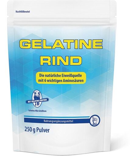 Anwendungsgebiet von Gelatine Rind Pulver BeutelGelatine Rind Pulver Beutel sind ein Nahrungsergänzungsmittel mit Gelatine-Protein. Trinkgelatine (Gelatina Alba Grießform) aus Rohstoffen vom Rind.Wichtige Inhaltsstoffe:Gelatine ist eine reine EiweißquelleGewonnen aus kollagenhaltigen, tierischen RohstoffenEnthält essenzielle Aminosäuren, die der Körper täglich benötigt, darunter: Glycin, Prolin, Alanin, Hydroxyprolin, Glutaminsäure, ArgininHohe Qualität & vielseitige Verwendung:Unterstützt Muskeln und GelenkeVielseitig einsetzbar beim Kochen und BackenHervorragende LöslichkeitWird auch in der medizinischen Produktion verwendetFrei von künstlichen ZusätzenHalal-zertifiziertWirkstoffe / Inhaltsstoffe / ZutatenGelatine Rind Pulver Beutel enthält:Zutaten: Gelatina Alba Grießform (Pulver)GegenanzeigenBei Überempfindlichkeit gegenüber einen der oben genannten Inhaltsstoffe sollte das Produkt nicht angewendet werden.DosierungVerzehrempfehlung von Gelatine Rind Pulver Beutel: Zweimal täglich 2 gestrichene Messlöffel (entspricht 10 g) Gelatine-Pulver in einer kalten Flüssigkeit wie Milch oder Fruchtsaft oder alternativ in Joghurt einrühren und direkt verzehren. HinweiseNahrungsergänzungsmittel sind kein Ersatz für eine gesunde und ausgewogene Ernährung und sollten außerhalb der Reichweite von Kindern aufbewahrt werden. Die empfohlene tägliche Verzehrmenge darf nicht überschritten werden.Bei Raumtemperatur, trocken und stets verschlossen lagern.Gelatine Rind Pulver Beutel können in Ihrer Versandapotheke www.apotheke.at erworben werden. ...