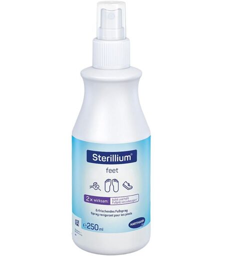Anwendungsgebiet von Sterillium Feet SpraySterillium Feet Spray: 2-fach wirksames Fußspray: Kühlt und kann prophylaktisch vor Fußpilz schützen.*24-Stunden-Geruchsschutz: Hält Ihre Füße den ganzen Tag lang frisch.Kein klebriges Gefühl. Nach jeder Anwendung ein trockenes Gefühl.Hinterlässt ein erfrischtes und sauberes Gefühl auf Ihren Füßen.Einfache Anwendungldeal für empfindliche Haut, die zu Trockenheit und Juckreiz neigt.Kann auch für Schuhe verwendet werden**Prophylaxe durch die reinigenden Eigenschaftender Inhaltsstoffe.** Materialverträglichkeit vorab an einer unauffälligen Stelle testen. Nicht auf Lackschuhen verwenden. Nur im Schuh verwenden.Sterillium Feet Spray pflegt kühlend und erfrischend und verleiht beanspruchten Füßen ein belebendes Gefühl. Gleichzeitig hilft das Fußspray Fußpilz vorzubeugen. Ein hohes Risiko, sich mit Fußpilz zu infizieren, besteht vor allem in Bereichen, in denen barfuß bzw. ohne Schuhe gelaufen wird, z.B. in• Wasch- und Duschräumen• Schwimmbädern• Saunas• Umkleidekabinen• Fitnessstudios• Solarien• HotelzimmernAußerdem:• Bei längerem Tragen von gleichem Schuhwerk, wie Gummistiefeln, Arbeitsschuhen, Sportschuhen• Bei längerem Tragen von Socken• Beim Verleih von Schuhwerk, z.B. von Bowling- oder SkischuheWirkstoffe / Inhaltsstoffe / ZutatenSterillium Feet Spray:Isopropyl Alcohol, Aqua, Benzalkonium Chloride.GegenanzeigenBei bekannter Überempfindlichkeit DosierungAnwendungsempfehlung von Sterillium Feet Spray:Gleichmäßig auftragen und 30 Sekunden lang trocknen lassen. Dabei eine vollständige Benetzung sicherstellen.HinweiseNach Anbruch: 12 Monate haltbarSterillium Feet Spray können in Ihrer Versandapotheke www.apotheke.at erworben werden. ...