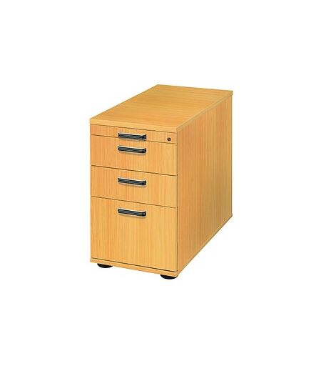 HAMMERBACHER Haziender Standcontainer buche 4 Auszüge 42,8 x 80,0 x 72,0 - 76,0 cm: die Ordnung macht'sDer HAMMERBACHER Haziender Standcontainer buche 4 Auszüge 42,8 x 80,0 x 72,0 - 76,0 cm ist der perfekte Aufbewahrungsort für alles, was Sie schnell zur Hand haben möchten. Wichtige Notizen, Akten und Büro-Utensilien finden genügend Platz im ansprechend gestalteten Korpus. Egal, ob Sie ihn links oder rechts neben Ihrem Arbeitsplatz oder freistehend im Raum aufstellen möchten – er macht immer eine gute Figur und ist die perfekte Lösung für mehr Stauraum.Perfekte SchubladenausstattungSie erhalten hier ein Möbelelement mit 4 Auszügen, genauer gesagt mit 1 Utensilienauszug, 2 Schubladen und 1 Hängeregistraturauszug. Diese Ausstattung bietet jede Menge Stauraum für Ihre Geschäftspapiere. Hinzukommt ein komfortabler und leiser Selbsteinzug und Softstopp. Die Schubladen sind aus Spanplatte gefertigt. Die einzelnen Schubladen können Sie bequem bis zu 75% aufziehen. Zu Ihrer Sicherheit verfügen die Schübe über eine Auszugssperre. Diese verhindert ein Kippen aufgrund des Eigengewichts der Schubladen. Auch das gleichzeitige Öffnen von zwei Schubladen ist deshalb nicht möglich.Verstellbare SockelfüßeDie hochwertigen Komponenten und die gute Verarbeitung zeichnen dieses Möbelteil aus. Holz ist das Material, aus dem der Korpus gefertigt wurde. Die Melaminharzbeschichtung macht dieses Möbelobjekt unempfindlich gegen Stöße, Hitze und Feuchtigkeit und ist zudem pflegeleicht. Die attraktive Farbe Buche des Möbelstücks fügt sich bestimmt gut in Ihre Einrichtung ein. Ein weiterer Vorteil sind die variabel verstellbaren Sockelfüße. Sie sind ideal, um Bodenunebenheiten auszugleichen und für einen festen Stand zu sorgen.Komfortables ÖffnenDas Öffnen und Schließen geht bequem dank der praktischen Relinggriffe. Die Griffe bestehen aus robustem Kunststoff.Ideal, wenn Sie abschließen möchtenSie können das Möbelobjekt zentral abschließen – ideal, damit nicht jeder Einsicht hat. Mit diesen Ausstattungsmerkmalen kann das Möbelelement außerdem überzeugen: mit Selbsteinzug und Soft-Stopp.Schneller Aufbau!Das Möbelelement kommt bereits aufgebaut zu Ihnen, sodass Sie dies nicht selbst übernehmen müssen.Ein zertifiziertes ProduktDas Möbelstück ist FSC®-zertifiziert. FSC® steht für "Forest Stewardship Council" und wurde zur Agenda 21 der Weltkonferenz für Umwelt und Entwicklung 1992 gegründet. Er tritt für eine Verbesserung der weltweiten Waldbewirtschaftung ein. Hierfür sind umfangreiche Standards und ein weltweit einheitliches Zertifizierungssystem mit eigenem Warenzeichen entwickelt worden, dem sogenannten FSC® Label.Welche Merkmale gibt es zu beachten?Bei Bestellung des HAMMERBACHER Haziender Standcontainers buche 4 Auszüge 42,8 x 80,0 x 72,0 - 76,0 cm erhalten Sie herausnehmbarem Hängerahmen zur Lieferung mit dazu. Das Gewicht liegt bei 52,6 kg. Beachten Sie die folgenden Maße: Die Außenmaße betragen 42,8 x 80,0 x 72,0 - 76,0 cm (BxTxH).Weitere Möbelelemente gewünscht?Ob im... ...