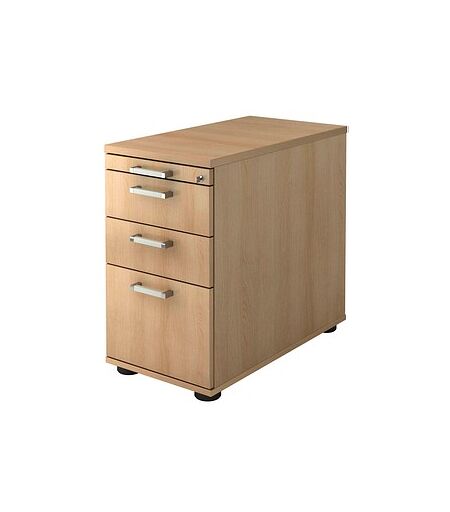 Für Ordnungsliebhaber – HAMMERBACHER Solid Standcontainer eiche 4 Auszüge 42,8 x 80,0 x 72,0 - 76,0 cmDer HAMMERBACHER Solid Standcontainer eiche 4 Auszüge 42,8 x 80,0 x 72,0 - 76,0 cm verhilft Ihnen zu mehr Unterbringungsmöglichkeiten für Unterlagen und sonstige Utensilien und schafft so mehr Platz und Übersicht. Da Sie das Möbelelement direkt neben dem Arbeitsplatz positionieren können, haben Sie immer alles in unmittelbarer Nähe.Welche Merkmale haben die Schübe?Das Möbelteil bietet 4 Auszüge und insgesamt folgende Aufteilung: 1 Utensilienauszug, 2 Schubladen und 1 Hängeregistraturauszug. Dies ermöglicht Ihnen eine strukturierte Ordnung mit vielen Ablagemöglichkeiten. Die Schubladen sind aus Kunststoff hergestellt. Die Schübe sind bis zu 75% ausziehbar und bieten eine komfortable Platznutzung. Um eine Verletzungsgefahr zu vermeiden, sind die Schubladen mit einer Auszugssperre ausgerüstet. Diese verhindert, dass dieses Möbelstück aufgrund seines Gewichts und zu weit herausgezogener Schübe kippt. Außerdem wird das gleichzeitige Öffnen von zwei Schubladen gebannt – denn Sicherheit geht vor.Komfortables ÖffnenDie schlichten Bügelgriffe wirken zeitlos und modern. Die Griffe sind aus langlebigem Stahl gefertigt.Mit AbschließmöglichkeitZum Schutz vor unbefugtem Zugriff können Sie das Möbelstück zentral abschließen. Mit diesen Merkmalen kann das Möbelelement außerdem überzeugen: Teleskop-Metall-Kugelführungen mit Selbsteinzug und Soft-Stopp.Mit Sockelfüßen, die verstellbar sindInteressante Informationen zu den Werkstoffen, die verbaut wurden, finden Sie hier: Das Material Holz, aus dem der Korpus gefertigt wurde, ist sehr beständig und verspricht langanhaltende Freude mit diesem Möbelteil. Die unempfindliche Oberfläche mit Melaminharzbeschichtung ist pflegeleicht und schützt vor Schrammen und Feuchtigkeit. Sowohl Korpus als auch Schubladen haben die Farbe Eiche. Das wirkt in jedem Büro sehr modern und attraktiv. Ein weiterer Vorteil sind die variabel verstellbaren Sockelfüße. Sie sind ideal, um Bodenunebenheiten auszugleichen und für einen festen Stand zu sorgen.Umweltverträglich hergestellt!Das Produkt ist FSC®-zertifiziert. FSC® garantiert kontrollierte und gute Herstellung. Nicht nur die Bestandteile, sondern auch die sozialverträglichen Bedingungen sind bei diesem Produkt geprüft worden und es ist somit FSC-zertifiziert.Innerhalb kürzester Zeit einsatzbereit!Beim Kauf dieses Möbelelements erfolgt die Zustellung aufgebaut. Einfach aufstellen – und fertig!Hier die wichtigsten MerkmaleBeachten Sie auch das Gewicht des Produkts – es wiegt 48,0 kg. Aus folgenden Werten setzen sich die wichtigsten Maße zusammen: Breite: 42,8 cmTiefe: 80,0 cmHöhe: 72,0 - 76,0 cmSind Sie ein Ordnungsliebhaber?Dann können Sie den HAMMERBACHER Solid Standcontainer eiche 4 Auszüge 42,8 x 80,0 x 72,0 - 76,0 cm gleich hier in unserem Online-Shop bestellen, Sie erhalten die Lieferung innerhalb kürzester Zeit. ...
