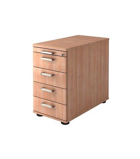 HAMMERBACHER Solid SC50 Standcontainer nussbaum 5 Auszüge 42,8 x 80,0 x 72,0 - 76,0 cm – steckt so einiges wegDer HAMMERBACHER Solid SC50 Standcontainer nussbaum 5 Auszüge 42,8 x 80,0 x 72,0 - 76,0 cm ist die ideale Erweiterung für Ihren Arbeitsplatz. Er bietet jede Menge Stauraum zur Aufbewahrung Ihrer Büro-Utensilien und Unterlagen. So starten Sie jeden Arbeitstag in einem aufgeräumten Arbeitsumfeld.In der Höhe verstellbar dank SockelfüßenDer Korpus besteht aus solidem Holz in einem klassischen Design. Die Möbeloberfläche hat eine widerstandsfähige Melaminharzbeschichtung. Das macht dieses Möbelstück besonders pflegeleicht. Der Korpus und die Schubladen haben die Farbe Nussbaum, die sich perfekt zu Ihrem Inventar kombinieren lässt. Die Sockelfüße sind verstellbar, was besonders von Vorteil ist, wenn das Möbelstück auf unebenem Boden steht.Schließen Sie ab!Hier können Sie vertrauliche Unterlagen bedenkenlos verstauen, denn das Modell ist abschließbar.Alles Interessante zur SchubladenausstattungDas Möbelstück bietet 5 Auszüge und insgesamt folgende Aufteilung: 1 Utensilienauszug und 4 Schubladen. Dies ermöglicht Ihnen eine strukturierte Ordnung mit vielen Ablagemöglichkeiten. Hier handelt es sich um Schubladen aus Kunststoff. Sie erhalten hier eine komfortable Platzausnutzung und Anwendung dank des 75%igen Auszugs. Die Schubladen sind mit einer Auszugssperre versehen, die dazu beiträgt, dass sie nicht zu weit herausgezogen werden. Auch das gleichzeitige Öffnen von zwei Schubladen ist dadurch nicht möglich.So sehen die Griffe ausZum komfortablen Öffnen und Schließen dienen die schlichten Stangengriffe. Die Griffe sind aus strapazierfähigem Metall gefertigt.Zertifizierte UmweltverträglichkeitDas Möbelstück ist FSC®-zertifiziert. FSC® steht für "Forest Stewardship Council" und wurde zur Agenda 21 der Weltkonferenz für Umwelt und Entwicklung 1992 gegründet. Er tritt für eine Verbesserung der weltweiten Waldbewirtschaftung ein. Hierfür sind umfangreiche Standards und ein weltweit einheitliches Zertifizierungssystem mit eigenem Warenzeichen entwickelt worden, dem sogenannten FSC® Label.Erfahren Sie mehr über die Maße und andere wichtigen MerkmaleEin weiterer wichtiger Wert ist das Gewicht – es liegt bei 48,0 kg. Damit Sie das Möbelstück uneingeschränkt nutzen können, beachten Sie folgende Maße: Breite: 42,8 cmTiefe: 80,0 cmHöhe: 72,0 - 76,0 cmWorauf Sie außerdem bauen könnenSie sparen hier wertvolle Zeit, denn die Anlieferung erfolgt bereits aufgebaut.Möchten Sie eine ordnungsschaffende Möbelergänzung für mehr Stauraum?Dann ordern Sie den HAMMERBACHER Solid SC50 Standcontainer nussbaum 5 Auszüge 42,8 x 80,0 x 72,0 - 76,0 cm einfach hier bei uns online! ...