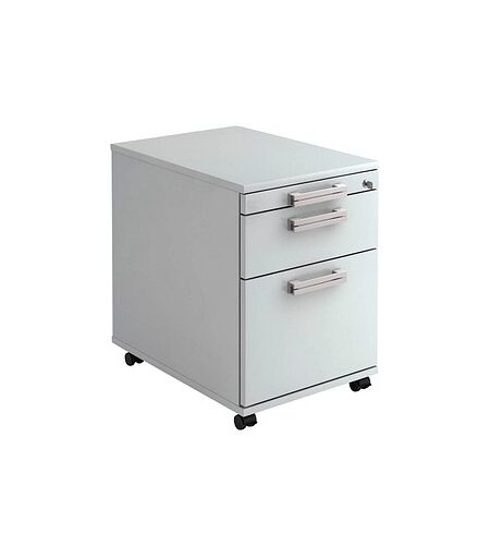 HAMMERBACHER AC20 NU Rollcontainer lichtgrau 3 Auszüge 42,8 x 58,0 x 59,0 cm: viel Platz für Ihre UnterlagenDer HAMMERBACHER AC20 NU Rollcontainer lichtgrau 3 Auszüge 42,8 x 58,0 x 59,0 cm sorgt dafür, dass Sie Ihre wichtigsten Dokumente, Unterlagen, Notizen und Büroutensilien immer schnell zur Hand haben. Er bringt Mobilität, Funktionalität und Design mühelos in Einklang und ist eine Bereicherung für jeden Büroraum. Bei Bedarf können Sie ihn dank seiner Rollen bequem verschieben. Um ein ungewolltes Wegrollen zu verhindern, hat das Modell eine Feststellbremse.Material und OberflächeDie hochwertigen Materialien und deren gute Verarbeitung zeichnen dieses Möbelstück aus. Holz, aus dem der Korpus angefertigt ist, hat eine lange Lebensdauer und besondere Robustheit. So haben Sie lange Freude an diesem Produkt. Die Möbeloberfläche hat eine unempfindliche Melaminharzbeschichtung. Das macht dieses Möbelstück besonders pflegeleicht. Sowohl Korpus als auch Schubladen haben die Farbe Lichtgrau. Das wirkt in jedem Raum sehr stylisch und attraktiv.So öffnen Sie dieses MöbelobjektMit den schlichten Relinggriffen, die ein schönes Detail sind, lässt sich dieses Möbelelement komfortabel öffnen und schließen. Die Griffe sind aus strapazierfähigem Stahl.Alle Eigenschaften der SchubladenbeschaffenheitFolgende Aufteilung bietet das Möbelteil: 3 Auszüge, das heißt: 1 Utensilienauszug1 Schublade1 HängeregistraturauszugDiese Ausstattung bietet jede Menge Stauraum für Ihre Geschäftspapiere. Die Schubladen ziehen sich mit einem kleinen Schubs von selbst ein und stoppen leise und ganz soft. Die Schübe sind aus Kunststoff hergestellt. Damit beim Herausziehen der Schübe das Möbelteil durch sein Eigengewicht nicht nach vorn kippt, wird das gleichzeitige Öffnen von zwei Schubladen und ein zu weites Herausziehen durch eine Auszugssperre verhindert – denn Sicherheit muss sein. Mit einer Auszugsöffnung von bis zu 80% können Sie die Schübe komfortabel nutzen.Ideal, wenn Sie abschließen möchtenDas Möbelstück ist zentral abschließbar, um Ihre Dokumente nicht für jedermann zugänglich zu machen. Mit diesen Eigenschaften kann das Möbelelement außerdem punkten: Mit Selbsteinzug und Soft-Stopp.Erfahren Sie noch mehr zu diesem ProduktDer Vollständigkeit zuliebe erhalten Sie bei Bestellung des HAMMERBACHER AC20 NU Rollcontainers lichtgrau 3 Auszüge 42,8 x 58,0 x 59,0 cm herausnehmbarem Hängerahmen inklusive. Damit Sie wissen, ob das Möbelstück für Ihre Räumlichkeiten geeignet ist, hier die wichtigsten Maße: 42,8 x 58,0 x 59,0 cm (BxTxH). Das Exemplar hat ein Gewicht von 28,6 kg.Zertifizierte Qualität!Das Produkt ist FSC®-zertifiziert, das heißt es garantiert eine umweltfreundliche und sozialverträgliche Herstellung. Das Holz stammt ausschließlich aus kontrolliertem Anbau aus Wäldern, die umweltgerecht und nachhaltig bewirtschaftet werden.Möchten Sie eine praktische Möbelergänzung für mehr Stauraum?Bestellen können Sie den HAMMERBACHER AC20 NU Rollcontainer lichtgrau 3 Auszüge 42,8 x 58,0... ...