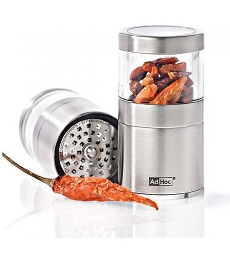 Der Mini Chilischneider Voyage von AdHoc ist durch seine kompakte Größe der ideale Reisebegleiter. Sein original AdHoc Schneidwerk© verfügt über spezielle Klingen aus Edelstahl mit geätzten messerscharfen Zähnen. Diese sind so gestaltet, dass getrocknete Chili zerschnitten statt gemahlen werden. So können sich ihre Aromen besser entfalten. Ein neues Genusserlebnis! robust und handlich leicht zu reinigen einfach zu füllen durch abnehmbaren Verschlussdeckel attraktiver Vorratscontainer Aromaschutzkappe schützt die Gewürze und sorgt für sicheren Chiligenuss Dazu besticht sie durch ihr außergewöhnliches und elegantes Acryl-Edelstahl-Design, bei dem der durchsichtige Kunststoffbehälter den Blick auf die Chilis frei lässt und das Gewürz selbst dadurch zum echten Eye-Catcher auf Ihrem Tisch wird. Warnhinweis: Lesen Sie aufmerksam die Sicherheitshinweise und benutzen Sie den Artikel nur wie in dieser Anleitung beschrieben, damit es nicht zu versehentlichen Verletzungen oder Schäden kommt. Bewahren Sie diese Anleitung zum späteren Nachlesen auf. Bei Weitergabe des Artikels ist auch diese Anleitung mitzugeben. Das Produkt ist kein Spielzeug. Halten Sie Kinder von Verpackungsmaterial fern. Es kann u.a. Erstickungsgefahr bestehen. ...