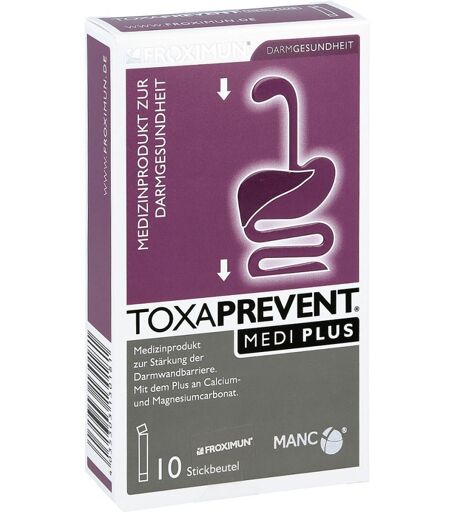 Anwendungsgebiet von Froximun Toxaprevent medi plus StickFroximun Toxaprevent medi plus Stick ist ein natürliches Medizinprodukt mit dem mineralischen Wirkstoff MANC®, einem natürlichen Zeolith-Klinoptilolith mit dem PLUS an Calcium- und Magnesiumcarbonat. Es dient der Stärkung der Darmwandbarriere bei wiederkehrender physischer Belastung. Der Wirkstoff MANC® durchläuft den Verdauungstrakt, entfaltet dort seine physikalische Wirkung und wird nicht verstoffwechselt.Wirkstoffe / Inhaltsstoffe / ZutatenCalciumcarbonat, Magnesiumcarbonat, Zeolith.GegenanzeigenBei bekannter Überempfindlichkeit gegenüber einem der oben genannten Inhaltsstoffe sollte dieses Produkt nicht angewendet werden.DosierungFalls von Ihrem Arzt oder Therapeuten nicht anders verordnet, nehmen Sie 1 – 2 Sticks TOXAPREVENT® MEDI PLUS ca. 30 Minuten vor einer Mahlzeit, mit reichlich Flüssigkeit (z.B. mit 200 ml stillem Wasser) ein. Eine Tageshöchstmenge von 2 Sticks (entspricht 2 mal 3 g Inhalt) sollte nicht überschritten werden. Sollten Sie von der Einnahmemenge abweichen wollen, so befragen Sie bitte zuvor Ihren Arzt oder Therapeuten.HinweiseDie Dauer der Behandlung mit Froximun Toxaprevent medi plus Stick sollte 30 Tage nicht überschreiten. Bei wiederholter Einnahme sollte eine Anwendungspause von mindestens einer Woche eingehalten werden.Froximun Toxaprevent medi plus Stick können in Ihrer Versandapotheke www.apotheke.at erworben werden. ...