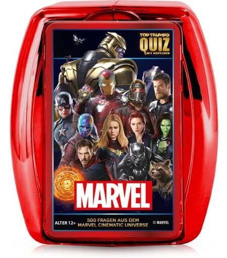 """Von Captain America und Iron Man über Thor und Ant-Man bis hin zu Guardians of the Galaxy: Wer die Marvel-Helden liebt, kann an diesem Spiel nicht vorbeigehen! Denn das QUIZ Marvel stellt euer absolutes Fan-Wissen auf die Probe. 500 Fragen auf 100 Karten zu 20 Marvel-Filmen tummeln sich in diesem Wissensspiel und warten nur darauf, von euch beantwortet zu werden. Findet mit mindestens 2 Spielern oder Teams ab 12 Jahren heraus, wie viele Informationen euch aus den Filmen in Erinnerung geblieben sind! 500 Fragen aus dem Marvel-Universum warten auf eure Antworten. Könnt ihr eure Gegner mit eurem Wissen übertreffen? Dieses QUIZ Marvel ist die perfekte Vorbereitung auf jedes übernatürliche Abenteuer und kann dank der praktischen Box auch ideal überall mit hingenommen werden. Welches Wahrzeichen von New York City ist der Treffpunkt von Captain America und Nick Fury? In welchem Land wird James Rhodes von AIM gefangen genommen? Wo befindet sich Scott Lang, als er den Ant-Man-Anzug zum ersten Mal aktiviert hat? " ...