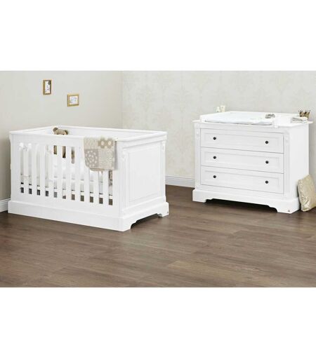 Das Sparset Emilia von Pinolino überzeugt durch sein romantisches Design mit stilvollen Fräsungen und edelmatter Lackierung. Charmant und detailverliebt präsentiert sich das 2-teilige Sparset, bestehend aus einem Kombi-Kinderbett und einer breiten Wickelkommode. Kinderbett Lieferumfang: Bettrahmen, Lattenrost 140 x 70 cm, 3-fach höhenverstellbar, 2 Gitterseiten mit 3 Schlupfsprossen, 2 Umbauseiten Material: MDF edelmatt lackiert Verwendung: als Kinderbett, zum Juniorbett oder Kindersofa umbaubar Aufwendige Fräsungen zieren die Stirnseiten und verleihen dem Kinderbettchen eine elegante Optik. Hübsche Zierelemente und geschwungene Sockelleisten unterstreichen das verspielte Erscheinungsbild gekonnt. Zur Schonung des Rückens ist der Lattenrost 3-fach höhenverstellbar, was die Eltern in den ersten Monaten begeistert. Kindern bietet das Gitterbett Sicherheit und Geborgenheit und auf Wunsch mit 3 Schlupfsprossen in den Gitterseiten mehr Bewegungsfreiheit. Ist das Kind alt genug, lässt sich das Bettchen mit den Umbauseiten zum formschönen Juniorbett oder gemütlichen Kindersofa umbauen. So bereitet das Bett lange Freude über das Kleinkindalter hinaus. Wickelkommode – breit Material: MDF Oberfläche: edelmatt lackiert Innenausstattung: 3 Schubkästen besondere Funktionen: Wickelaufsatz abnehmbar, Self-Soft-Close, Möbelknöpfe aus Metall Maße: 119(B) x 101(H) x 58/78(T) cm ohne/mit Wickelaufsatz Die Wickelkommode glänzt mit ihren aufwendigen Einfräsungen an den Seitenteilen und Sockelleisten. Die Schubkästen bezaubern im erlesenen Kassetten-Design und mit edlen Möbelknöpfen aus Metall. Die Kommode hat noch weit mehr zu bieten als elegante Oberflächen. Alle 3 Schubkästen sind mit Self-Soft-Close System ausgestattet, was sie selbstständig leise und sanft schließen lässt. Das ist gerade im Krabbel- und Lauflernalter praktisch. Damit wird ein Hochziehen an offenen Schubkästen und Einklemmen der zarten Fingerchen verhindert. Laute Schließgeräusche, die einen ruhigen Schlaf des Kindes stören, gehören der Vergangenheit an. In den breiten Schubkästen findet sich ein großzügiger Stauraum für Bettwäsche, Kleidung und Wickelutensilien. Mit einer komfortablen Wickelhöhe von 94 Zentimetern und einer Abstellfläche bietet die Kommode optimale Voraussetzungen. Der Wickelaufsatz ist abnehmbar und verwandelt die Wickelkommode in ein schönes Sideboard, passend zum Juniorbett oder bequemen Kindersofa. Garantie-Hinweis Informationen zu den Garantie-Bedingungen erhältst Du hier. Hinweise Die Lieferung erfolgt zerlegt, mit Aufbauanleitung und ohne Dekoration. ACHTUNG: Bitte bei der Bestellung eine Telefonnummer mitangeben, da dieser Artikel mit der Spedition geliefert wird! ...