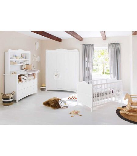 Think big: Das dreiteilige Babyzimmer Florentina kommt mit extrabreiter Wickelkommode, dreitürigem Kleiderschrank und Babybett. Raffiniert: Ein extrabreiter Regalaufsatz für die Wickelkommode bringt noch mehr Stauraum mit. Babybett Florentina 70 x 140 cm Lieferumfang: Babybett Florentina, höhenverstellbarer Lattenrost, Schlupfsprossen, Umbauseiten Material: aus lackierter Kiefer Verwendung: umbaubar zum Juniorbett Maße: 146(L)x 76(B) x 87(H) cm, Höhe Lattenrost 16 - 32 - 48 cm Das Kinderbett Florentina bietet bereits den Allerkleinsten mit einer Liegefläche von 140 mal 70 Zentimetern einen komfortablen Ort zum Träumen, Entspannen und Schlafen. Der dreifach verstellbare Lattenrost schont den Rücken der Erwachsenen beim Hineinlegen und Herausheben des Nachwuchses. Je nach Größe und Entwicklungsstand des Kindes kann zwischen 16, 32 und 48 Zentimeter Höhe gewählt werden. Schlupfsprossen erleichtern den Ein- und Ausstieg, sobald die Kleinen selbständiger werden. Das im Lieferumfang enthaltene Umbau-Set kommt etwa ab dem dritten Lebensjahr des Kindes zum Einsatz. Als moderne Junior-Variante im geschwungenen Design begleitet das stabile Bett aus teilmassiver Kiefer den Nachwuchs circa bis zum sechsten Geburtstag. Wickelkommode Florentina extrabreit mit extrabreitem Regalaufsatz Material: Dekor, uni weiß Innenausstattung: 2 Schubkästen, 2 offene Fächer; Regalaufsatz mit 2 höhenverstellbaren Einlegeböden besondere Funktionen: Regal- und Wickelaufsatz abnehmbar, Wickelaufsatz wahlweise links, mittig oder rechts montierbar (bei abgenommenem Regalaufsatz), 3 Möbelknopf-Sets zur Individualisierung Maße: 130(B) cm x 77/57(T) x 180(H) cm, Wickelhöhe 93 cm Eine elegant geschwungene Linienführung prägt das Design der Wickelkommode Florentina. Neben zwei offenen Fächern und zwei Schubkästen bietet der praktische Regalaufsatz zusätzlichen Stauraum. Auf zwei höhenverstellbaren Einlegeböden finden Feuchttücher, Cremes oder andere Utensilien Platz. Die Wickelhöhe von 93 Zentimetern macht den Windelwechsel auch für die Erwachsenen komfortabel. Durchdacht: Der Wickelaufsatz lässt sich rechts, links oder mittig auf der Kommode montieren. Bitte beachten: Das funktioniert nur, wenn der Regalaufsatz abgenommen wird. Sobald die Kleinen dem Windelalter entwachsen sind, lassen sich Wickel- und Regalaufsatz einfach entfernen. So wird aus der Wickelkommode ein hübsches Sideboard. Kleiderschrank Florentina groß 3-türig Material: Dekor, uni weiß Innenausstattung: 3 Türen, 6 höhenverstellbare Einlegeböden, 1 Kleiderstange Besonderheiten: 3 Möbelknopf-Sets zur Individualisierung Maße: 140(B) x 57(T) x 180(H) cm Hier ist Platz für alles: Der 140 Zentimeter breite Kleiderschrank kommt mit drei Türen, sechs höhenverstellbaren Einlegeböden und einer langen Kleiderstange. So können Kinderkleidung und Co. ordentlich verstaut werden. Tolles Detail: Im Lieferumfang sind drei Möbelknopf-Set zur Individualisierung enthalten. Die Knöpfe kommen in den Trendfarben Rosa,... ...