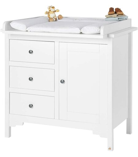 Die Wickelkommode Chalet breit von Pinolino bereichert die Einrichtung des Kinderzimmers im romantischen Stil. Dank ihres abnehmbaren Aufsatzes verwandelt sie sich bei Bedarf ganz einfach in ein klassisches Sideboard. Material: MDF, Dekor uni, weiß, edelmatt, Möbelknöpfe aus Metall Ausstattung: 3 Schubladen, 1 Tür, 2 Einlegeböden, abnehmbarer Wickelaufsatz Funktionen: Self-Soft-Close-System, Soft-Close-System Maße: 103(B) x 78(T) x 103(H) cm, ohne Wickelaufsatz, 103(B) x 58(T) x 103(H) cm, Wickelaufsatz 85(L) x 75(B) cm, Wickelhöhe 95 cm, Belastbarkeit bis 15 kg Die Wickelkommode Chalet breit bietet Dir einen ebenso stilvollen wie praktischen Platz für die Babypflege. Auf einer Höhe von 95 Zentimetern kannst Du Deinem Kleinen entspannt die Windeln wechseln, es waschen oder anziehen. Sämtliche Utensilien, die Du dafür benötigst, lassen sich griffbereit in der Kommode verstauen: Das Möbelstück verfügt über drei praktische, sanft und leise schließende Schubladen für Wechselwäsche, Pflegeprodukte und Co. Hinter seiner Tür befindet sich ein weiteres Fach mit zwei verstellbaren Einlegeböden. Da der Wickelaufsatz abnehmbar ist, überzeugt die Kommode mit einer langen Nutzungsdauer. Sobald Dein Mini dem Windelalter entwachsen ist, verwandelst Du das Design einfach in ein klassisches Sideboard. ...
